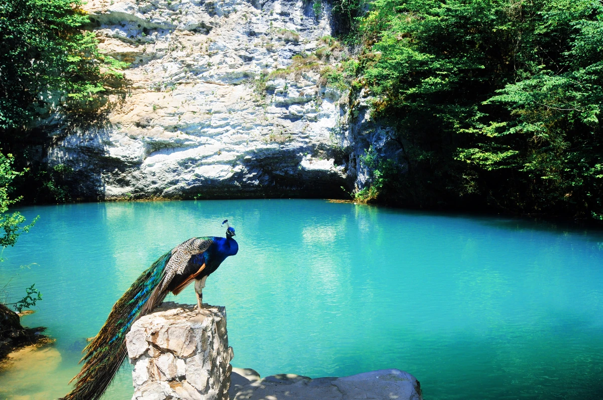 Наш путь начнется с дороги вдоль бурной реки Бзыбь. Первая остановка — мистическое Голубое озеро. Это сапфир в каменной оправе: вода здесь невероятного ярко-бирюзового цвета, который не блекнет даже в пасмурную погоду. Озеро считается бездонным, и, по легенде, умывание его водой дарит молодость.